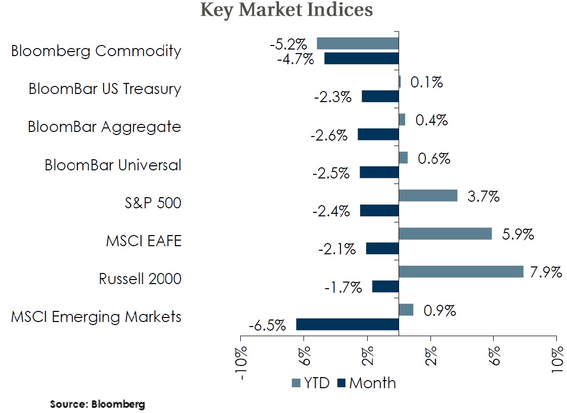 - Market sentiment was driven by the expectation of further interest rate hikes from the Fed, as hawkish Fed messaging and higher than expected January inflation impaired the outlook for risk assets and sent all broad equity indices negative for the month.