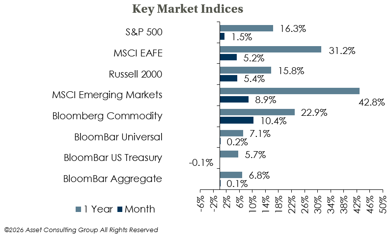 - Equity indices were broadly positive in January, with US large caps lagging both US small caps and Non-US stocks.