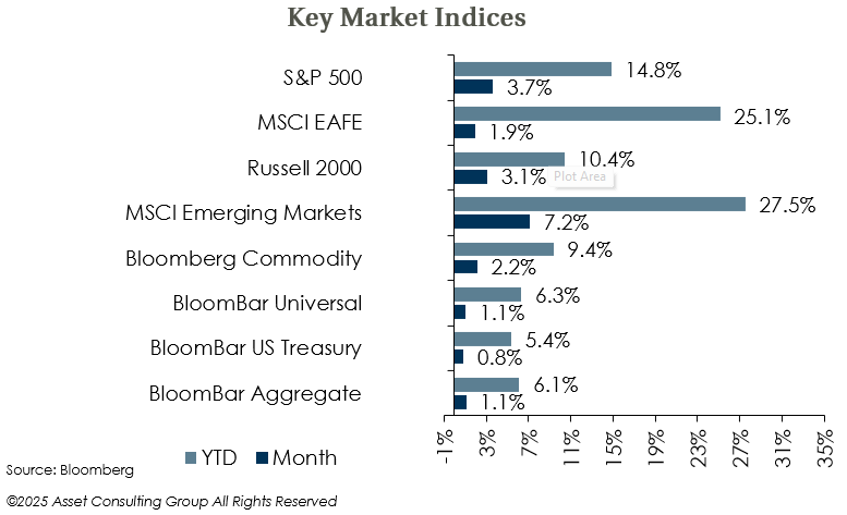 Equities rose in September as solid earnings and central bank policy easing helped sustain the recent rally. The emerging markets index was the top performer, supported by strong returns from Chinese equities where export resilience and higher levels of share buybacks have fueled excellent 2025 performance.